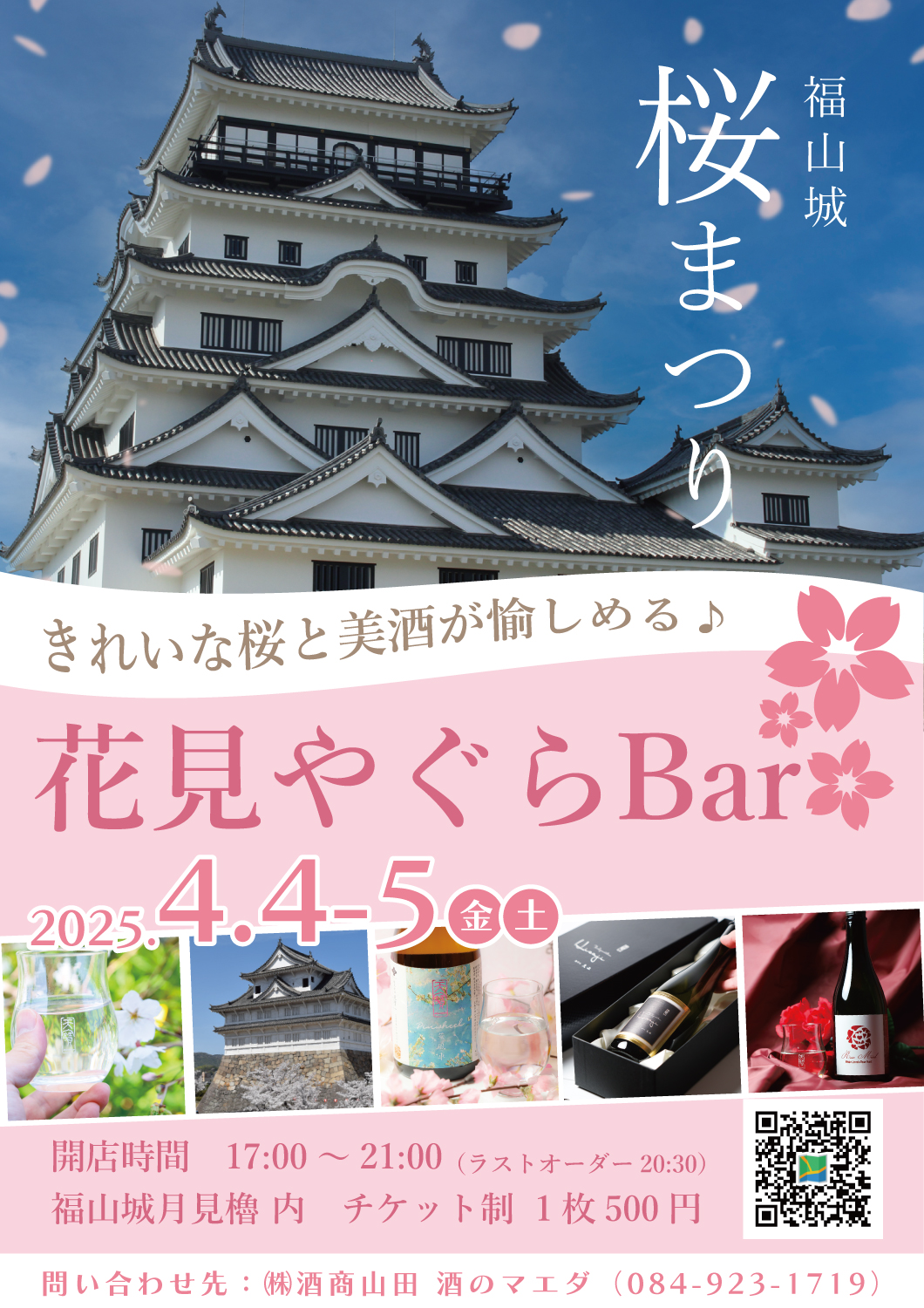 福山城桜まつり2025 花見やぐらBar 4/4~5 2025年3月28日 2025年4月4日~5日の2日間。福山城 月見櫓にて綺麗な桜と美酒が愉しめるイベントを開催します。 当日チケット制一枚500円で美味しいお酒を桜とともにお楽しみいただけます。 桜のディスプレイが施された会場も🌸花見がてら是非遊びに来てください!