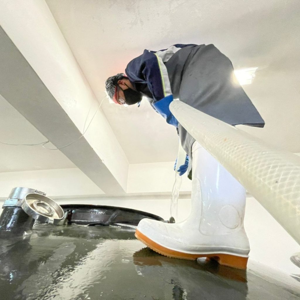 タンク内に熱湯をかけながら溜めていき、キャップをしてタンクの外側にも熱湯をかけて終了!これを1日置きます。