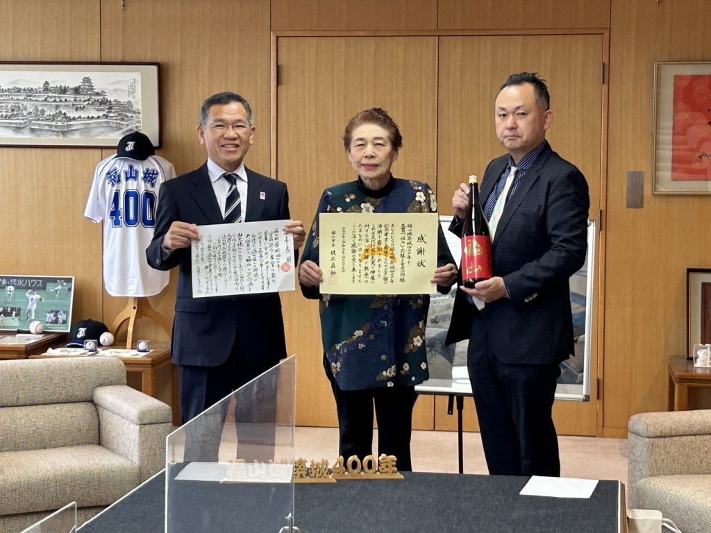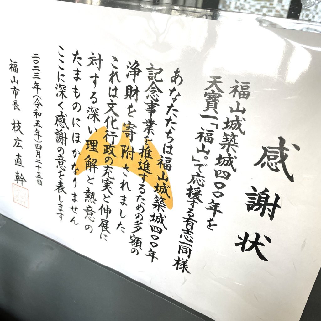 福山市から感謝状を頂きました。 2023年5月9日 福山城築城400年記念ラベル「福山。」を令和元年より発売し、売上金額の一部を福山市へ寄付を行ってまいりました。そして今年度は築城400年事業もフィナーレを迎え、この度枝広市長より感謝状を頂きました。 福山城築城400年記念ラベル「福山。」の販売は3月まででしたが、今後もこのお酒を販売し引き続き寄付を行う事となりました。これからも地域に貢献できるよう努めて参ります。