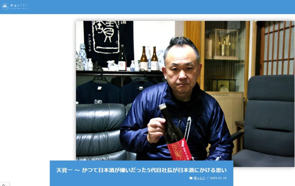 『備後とことこ』にて天寶一をご紹介いただきました 2025年1月16日 広島県福山市・尾道市、岡山県笠岡市など「備後経済圏」の観光施設・飲食店・イベント情報を中心に発信するWEBメディア『備後とことこ』にて、天寶一をご紹介いただきました。 備後とことこタイトル - 備後とことこhttps://bintoco.com/tenpoichi/天寶一は広島県福山市神辺町の歴史ある酒蔵です。「和食を生かす名脇役」をコンセプトに「超辛」シリーズなどで知られています。5代目社長の村上康久さんから天寶一や日本酒にかける思いをうかがいました。 天寶一の歴史から日本酒が置かれている現状、ローズマインドについてなど詳しく載っていますので是非ご覧ください。