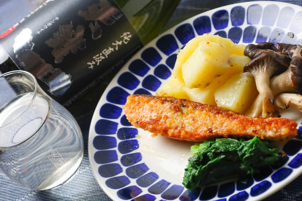 本日はこの時期にしか飲めない「純大直汲み」とサーモンのムニエルの食べ飲み合わせです。