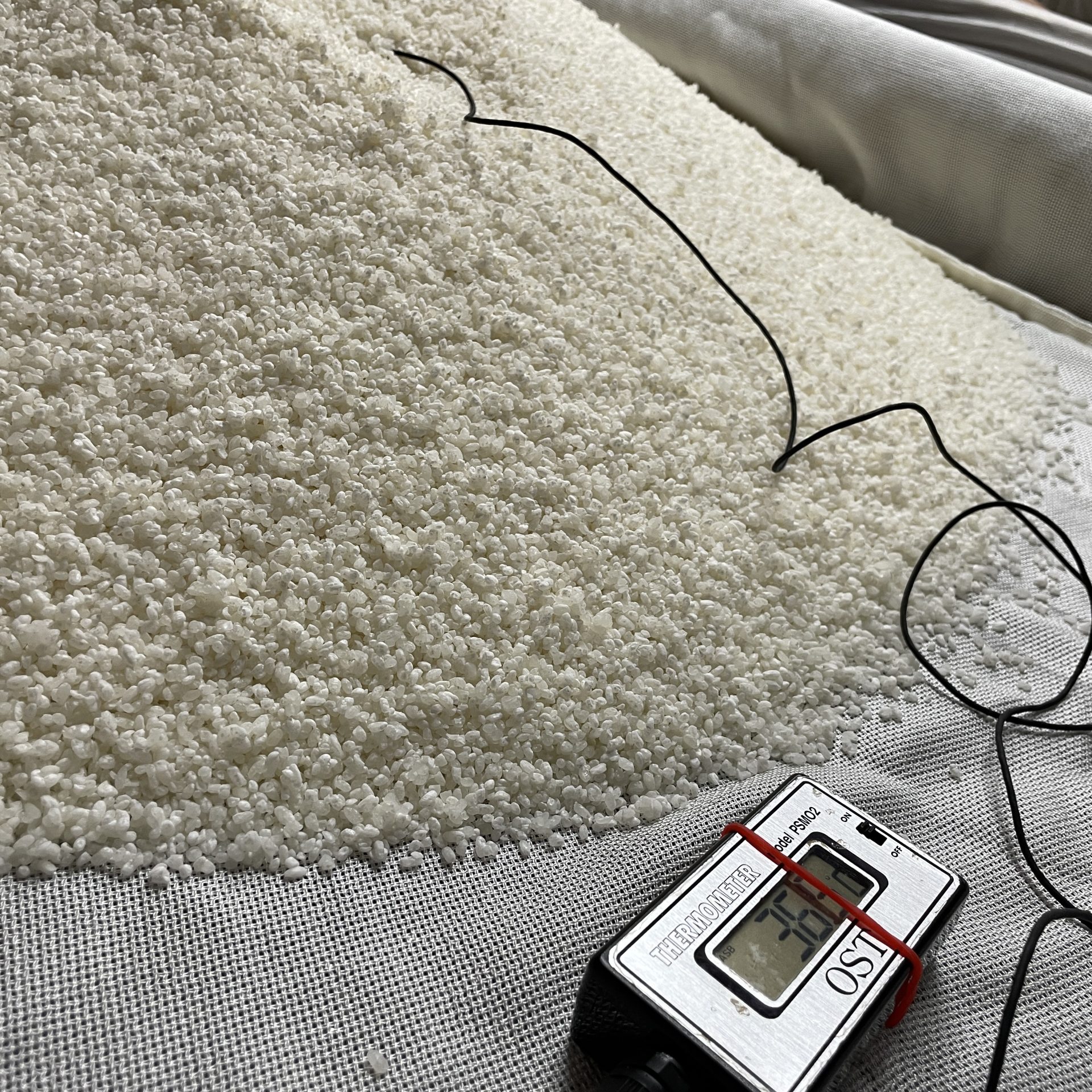 床もみの工程が終了し10~12時間寝かされた米は表面が少し乾燥し、麹菌の繁殖により米粒どうしがくっついている状態になります。