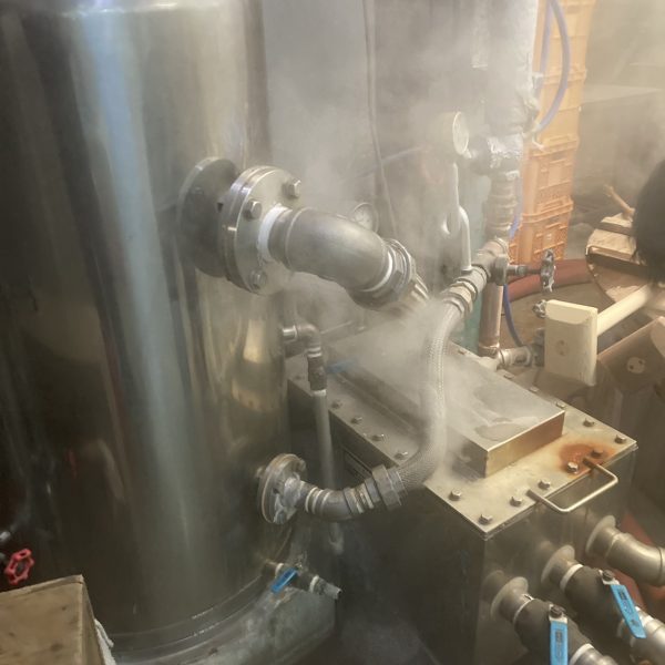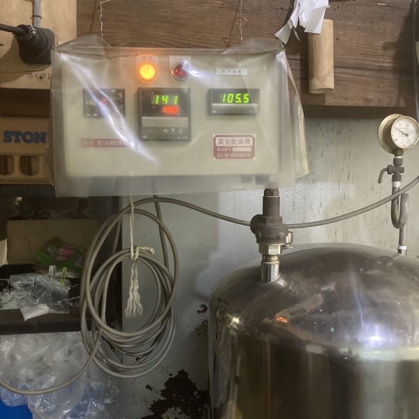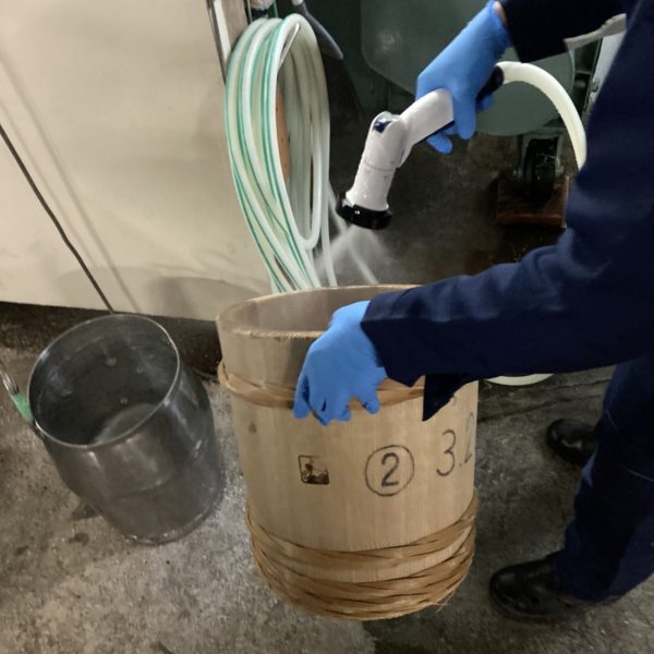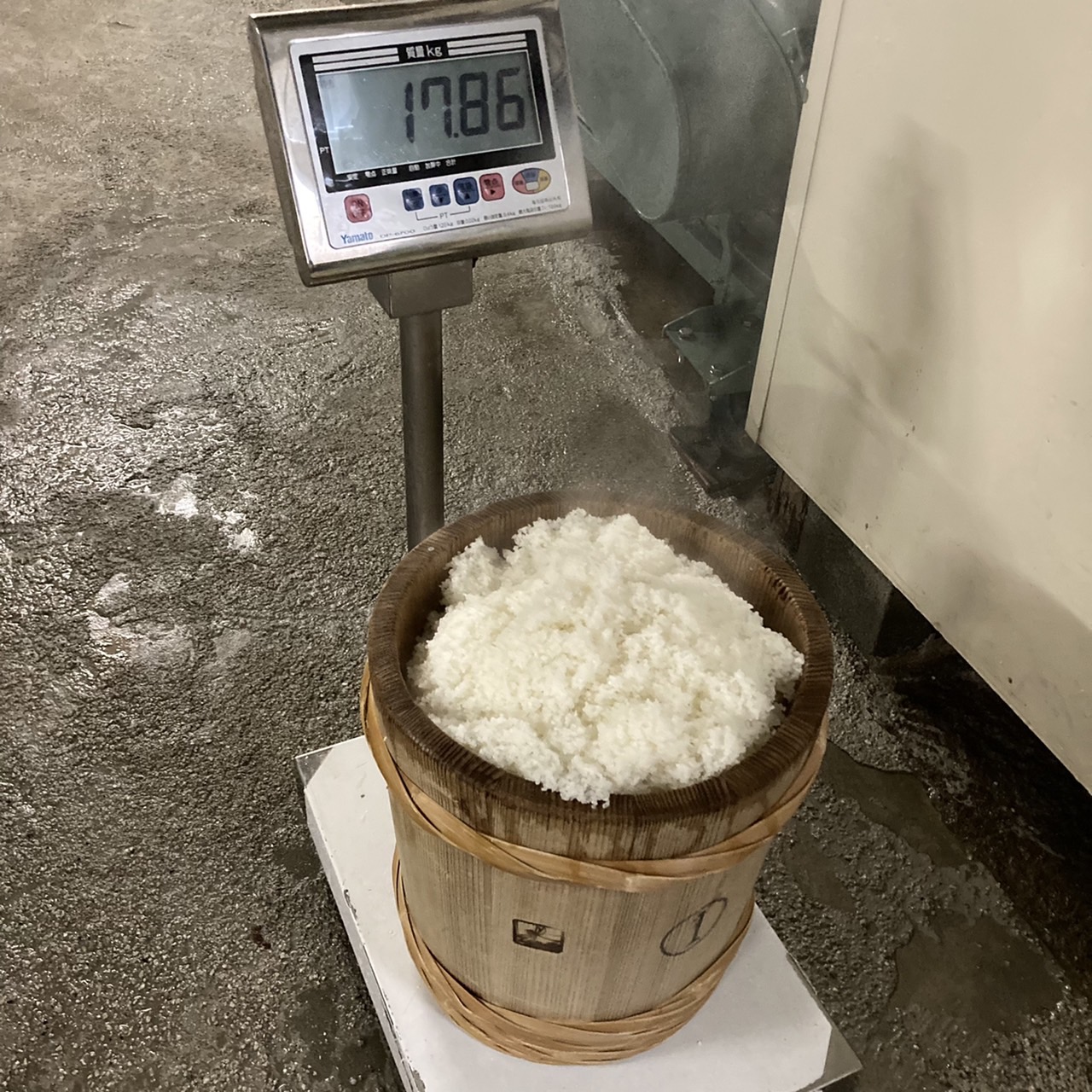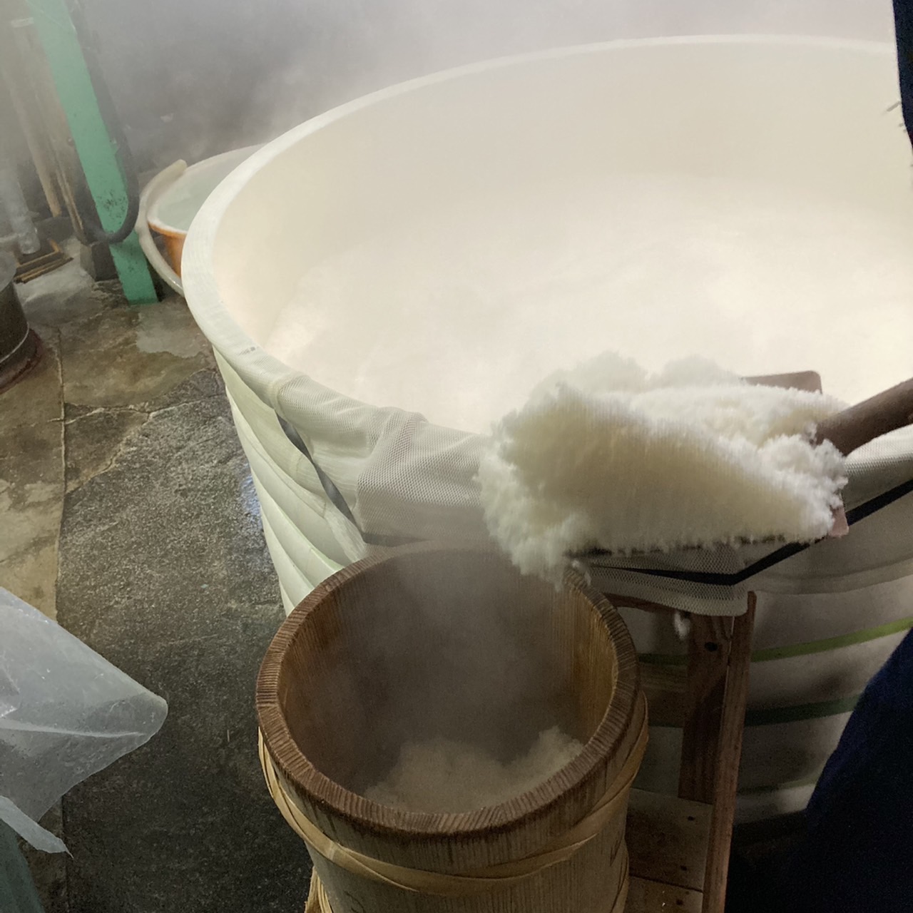 酒造りの風景「米を蒸す(蒸し)」 ——— 酒造りの工程「蒸米」 ——— 麹・酒母・もろみを造る各工程で用いられるので重要な醸造工程 米を蒸すという事を「蒸米」といいます。蒸す事により白米重量の約10%の水分が吸収されます。蒸時間は蒸気が抜け渡ってから蒸しが終了するまでの時間をいいます。日本酒造りの工程のひとつ「蒸米(じょうまい)」についてご説明します。 酒造りではお米は「炊く」ではなく「蒸す」 食用のお米は通常炊くことでごはんとして食卓に並べられます。しかし、日本酒を造るときはお米を炊くことはしません。炊いたごはんはモチモチしていて美味しいですが、麹造りにおいては粘りが強いと作業性が悪くもろみに入れるとすぐ溶けてしまいます。米が溶けすぎるとそこに含まれる雑味成分も一緒に溶けだしてしまうのです。ある程度硬い蒸米を使うことで理想の麹菌を繁殖させる事ができます。 天寶一のこだわりとして「1に蒸し、2に蒸し、3に蒸し」 蒸米は麹・酒母・もろみを造る各工程で用いられるので重要な醸造工程の一つです。日本酒を造るときのお米は洗って吸水させたお米を甑(こしき)という大型のせいろと窯を使って蒸すという作業を行います。天寶一のこだわりとして、特別に改良してもらった甑(こしき)にて米の表面をさらっとさせる為、蒸気を乾燥させる機械を用いながら110℃の温度で蒸し上げます。蒸し上がる10分前に140℃近くまで上げ、米の表面がさらっと、中身は水分がしっかりと入った内軟外硬(ないなんがいこう)な弾力ある蒸米を理想としています。あらかじめ木桶はオゾン水にて洗浄しておきます。蒸し上がり後、麹米はすべて重量を計ります。米の品種によって「米洗い吸水後・蒸し上がり後・出麹後」水分の変化をデータ化する事で蒸し上がり時間等を決めています米洗いや蒸し上がり時間、温度が適当だと米の表面がべたついてしまいます。この状態の蒸米を麹室で乾かすと糊状にくっつき、一粒一粒に麹菌が繁殖できなくなり、味が重く理想の酒質になりません。天寶一では「洗米での限定吸水・蒸し上がりの蒸気温度・蒸し上がり時間」を今までの経験に基づき、弾力ある蒸米を造り米の表面はさらっと、そして米の芯にしっかりと水分を保った蒸米に仕上げています。弊社のこだわりとして「1に蒸し、2に蒸し、3に蒸し」と、とにかく蒸し上がりにこだわる事が次の理想の麹に結び付きます。