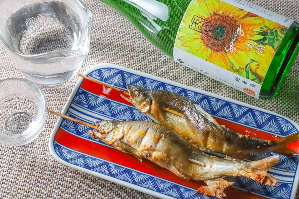 鮎特有の爽やかな香りと、身のふっくらとした食感、そして塩によるシンプルな旨味がドライな冷酒と見事にマッチします。