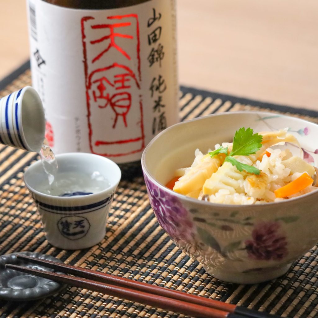 山田錦純米酒の常温もしくはぬる燗と、タケノコご飯が